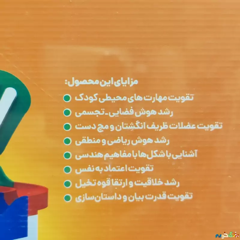 این محصول برای 4 سال به بالا مناسب است و قطعات موجود در جعبه در یک عکس کاملا مشخص است